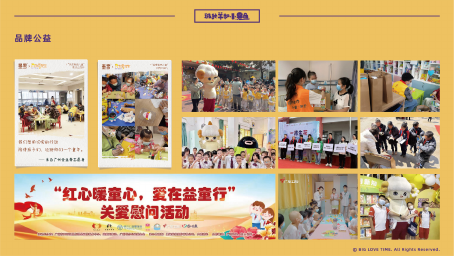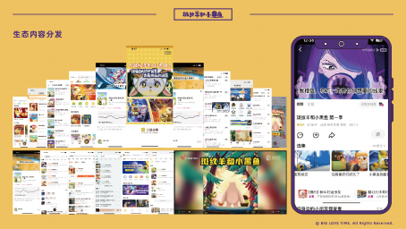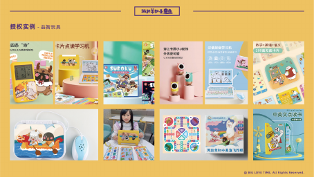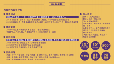 斑纹羊和小黑鱼关于冒险X童话X正能量的3000多个原创故事,致力打造中国版的“迪士尼”。实体童话故事书、线上数字故事平台,婴童用品、早教益智、儿童服装、潮玩文创等衍生品授权、线下主题乐园、线下活动,王老吉、广州地铁形象、广东有限电视台、威露士、佐丹奴、羊城通等联合推广,合作友商超级丰富。