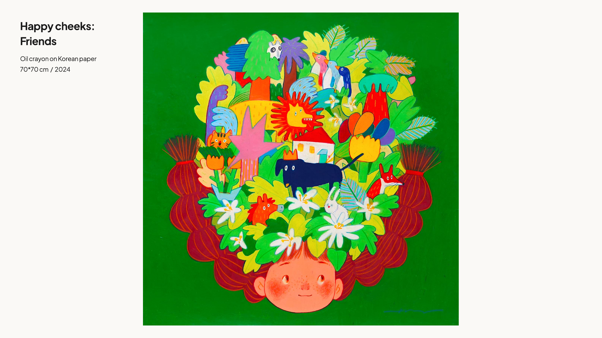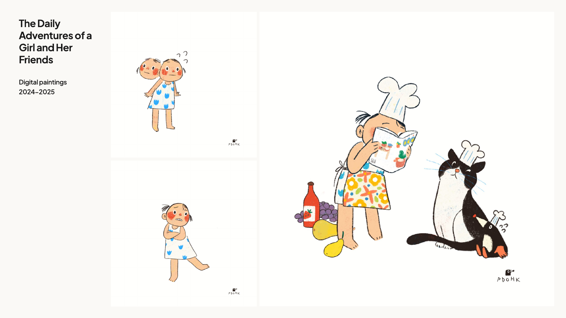 作品风格温暖、治愈,常以小女孩与朋友的日常冒险为主题,融合数字绘画与传统油画棒技法创作。