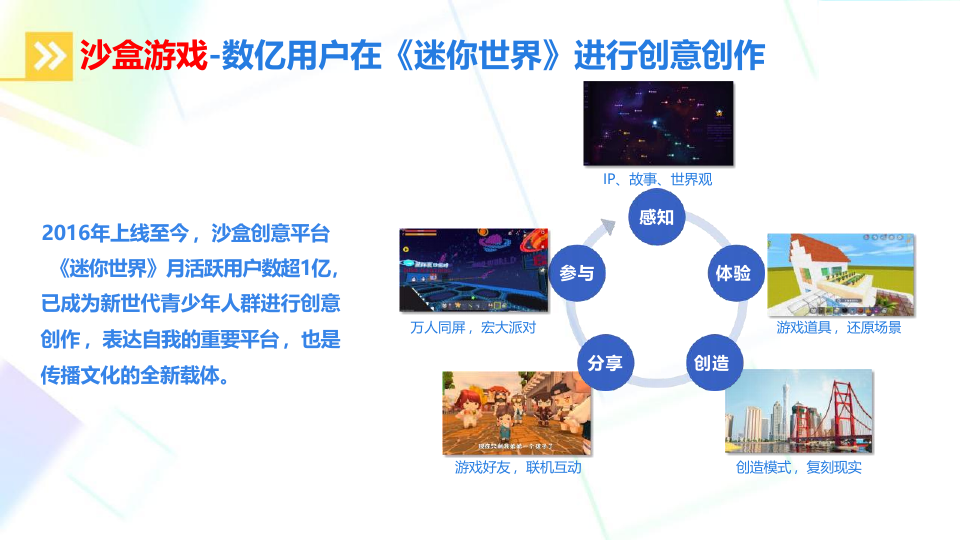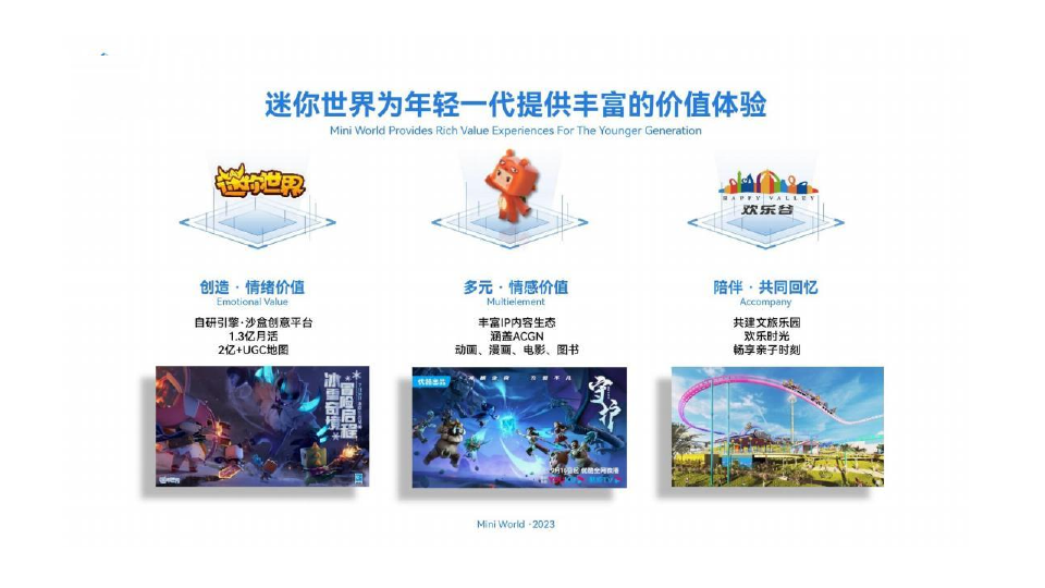 超10亿用户,月活1亿 ,用户偏年轻,堪比“数字时代的超级乐高”,“对孩子们来说,它不只是一个游戏,更像一个 ‘线上游乐场’ 。他们约着一起上线,不是在打架,而是在里面一起盖房子、玩捉迷藏、开派对、甚至上课。它构建了一个属于他们自己的虚拟世界和社交圈子。” 是Z世代(新时代年轻人)的虚拟社交空间,承载了他们的友谊和童年记忆。
